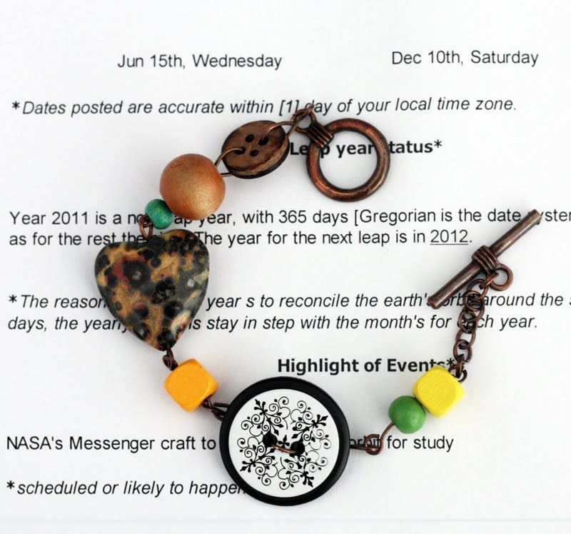 bracelet made of copper elements, wooden beads, natural stone heart, and buttons. Priced at $8